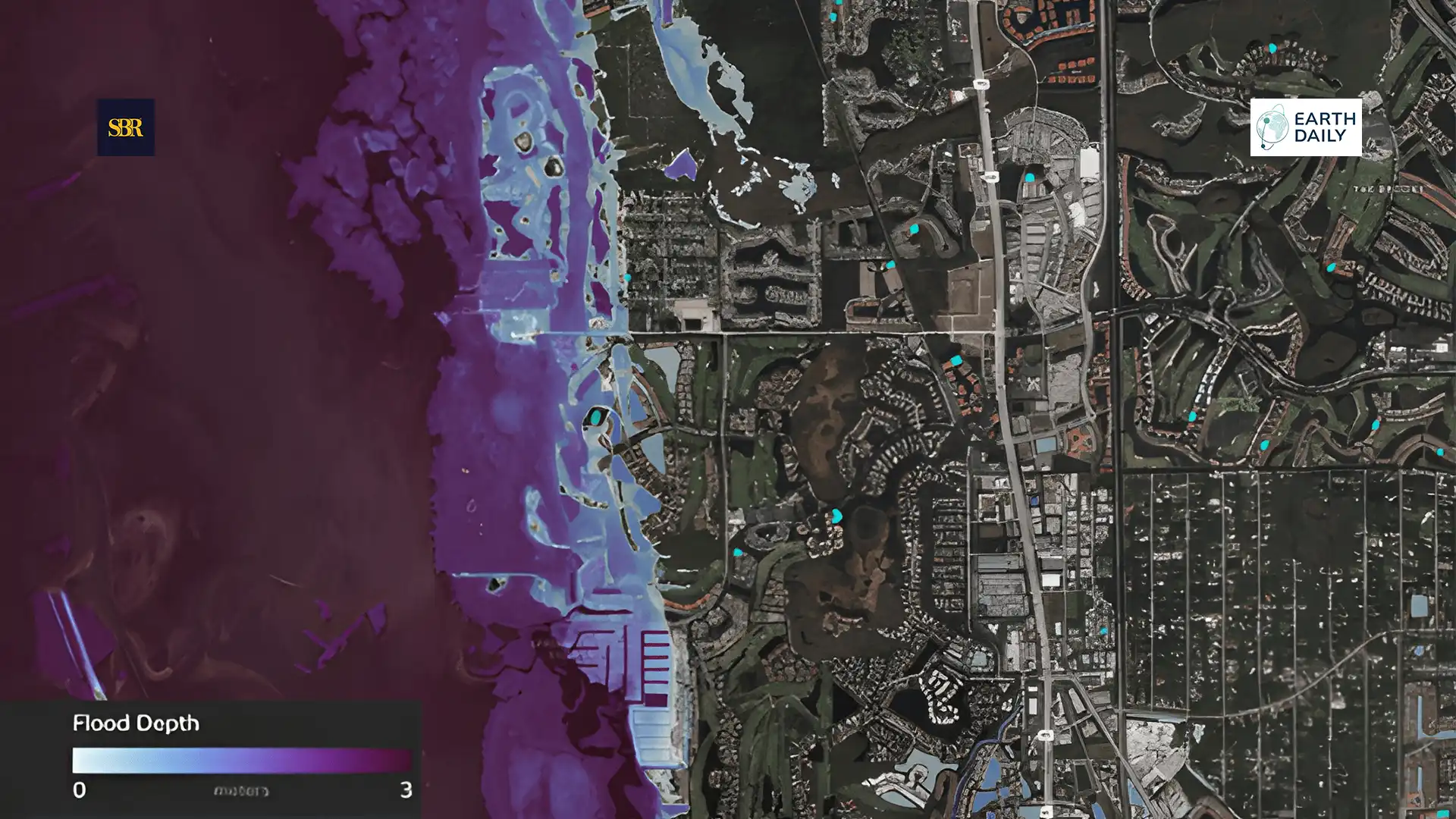 Original carrier policy location (left) indicated no flooding. EarthDaily’s corrected geocoded location places the asset at the building footprint and shows 0.92 m of flooding. The discrepancy stems from a 114 m geocoding error that positioned the asset on the road in front of the building. Flood extent shown in blue is derived from ICEYE data from Hurricane Ian.